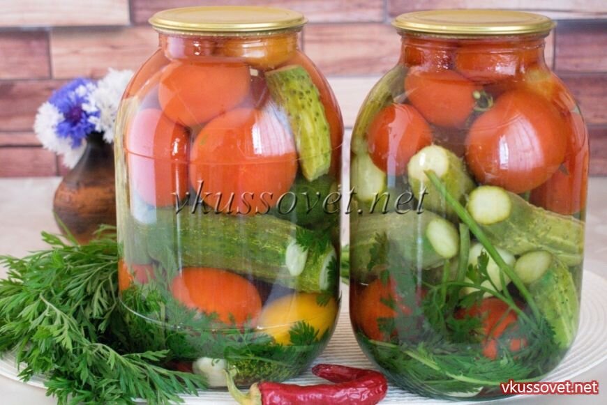 Рецепт приготовления ассорти из огурцов и помидоров на зиму с морковной ботвой. Вы наверняка знаете, что некоторые хозяйки предпочитают мариновать огурцы или помидоры с морковной ботвой. Сейчас на просторах интернет-ресурсов можно найти множество рецептов, как замариновать отдельно огурцы или помидоры с ботвой, да и сам состав ингредиентов везде разный. Этот рецепт можно назвать универсальным, по нему можно мариновать овощи как вместе (ассорти), так и по отдельности: либо только огурцы, либо томаты. Но особый вкус получается, когда в одной банки разные овощи, они гармонично друг друга дополняют, например, помидоры придают нежный привкус огурцам. Для маринования ассорти можно брать любые огурцы и помидоры, но удобнее консервировать, да и на столе аккуратнее будут смотреться маленькие плоды, а разноцветные томаты добавят еще больше настроения в зимний сезон. Необходимые ингредиенты две 2-х литровые банки: 1 кг. огурцов (маленьких); 1 кг. помидоров (мелких); ботва двух морковок; 2 зо