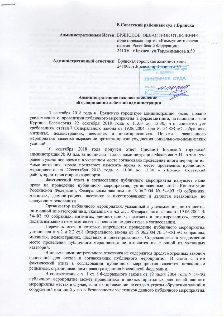 Брянский обком КПРФ подал в Советский районный суд г. Брянска заявление с требование признать незаконными действия Администрации города Брянска вновь издевательски предоставившей для митинга ПРОТИВ ПОВЫШЕНИЯ ПЕНСИОННОГО ВОЗРАСТА, перерытый и перекопанный пустырь на стройплощадке старого аэропорта для митинга 22 сентября 2018 года.