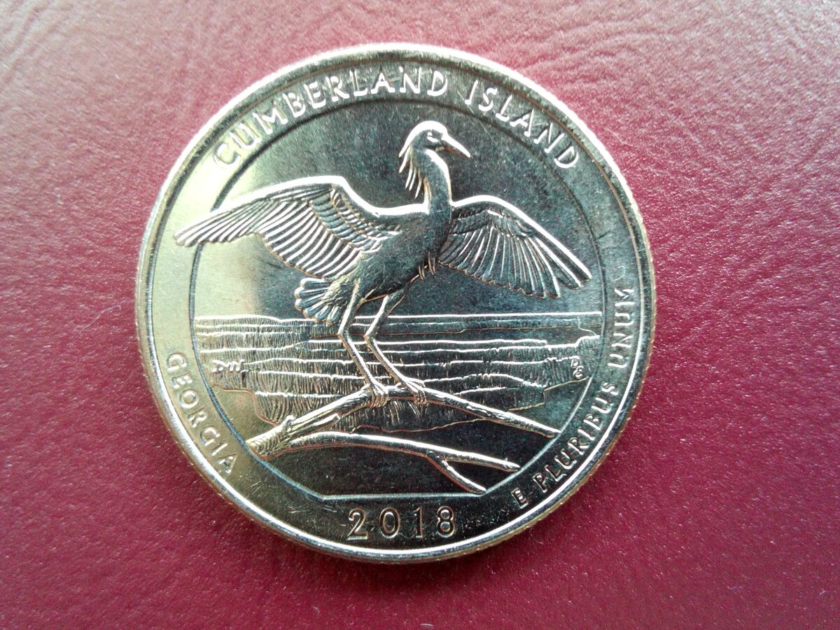 На обзор представлен экспонат – квотер (25-центовик) США «Национальное побережье острова Кумберленд» современного периода чеканки, юбилейный выпуск 2018 года. Оригинальное название монеты – Cumberland Island. Монета входит в серию юбилейных квотеров «Национальные парки», выпускаемую в США с 2010 года. Одна из пяти, отчеканенных в 2018 году. На аверсе монеты мы можем наблюдать профиль Джорджа Вашингтона и надписи: IN GOD WE TRUST / JF / LIBERTY / QUARTER DOLLAR / UNITED STATES OF AMERICA. Реверс монеты содержит стилизованное изображение национального парка и надписи: 2018 / CUMBERLAND ISLAND / DE / DW / E PLURIBUS UNUM / GEORGIA. Изображение на реверсе выполнено в четкой, элегантной стилистике. Оно имеет следующую композицию: на первом плане снежная цапля с раскрытыми крыльями, сидящая на ветке дерева и готовая взлететь. На заднем плане ровный островной пейзаж из солончаков. Национальное побережье острова Кумберленд расположено в юго-восточной части штата Джорджия, у побережья Ат