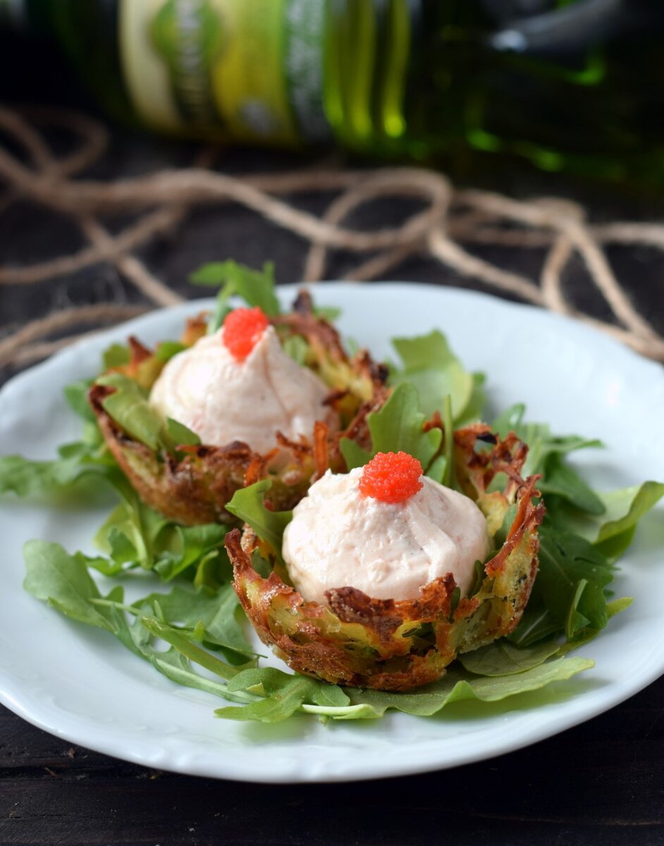 Друзья, подпишитесь на канал Кулинарный Гороскоп! С нами Вы ни за что не останетесь голодными! Салат из лосося в хрустящей картофельной корзинке не только вкусно, но и выглядит очень интересно. Такие тарталетки — отличная идея для праздничной закуски или небольшого семейного ужина. Ингредиенты: 4 больших картофеля луковица 1 яйцо 50 г твердого сыра растительное масло форма для кексов 1 ч. ложка муки соль, специи по вкусу Начинка: листья салата 120 г копченого лосося около 135 г плавленого сыра 2 ст. ложки майонеза соль, перец сок лимона красная икра Я очистите картофель, натрите его на крупной овощной терке, положил его на сито и тщательно ополосните холодной водой, чтобы избавиться от излишка крахмала. Позвольте всей жидкости сбежать, приправьте картофель солью и свежим молотым перцем. Луковицу натрите на мелкой терке, отожмите луковый сок и добавьте к картофелю. Также вмешайте куриное яйцо, натертый сыр, муку и специи, все тщательно перемешайте. Если в миске под картофелем собир