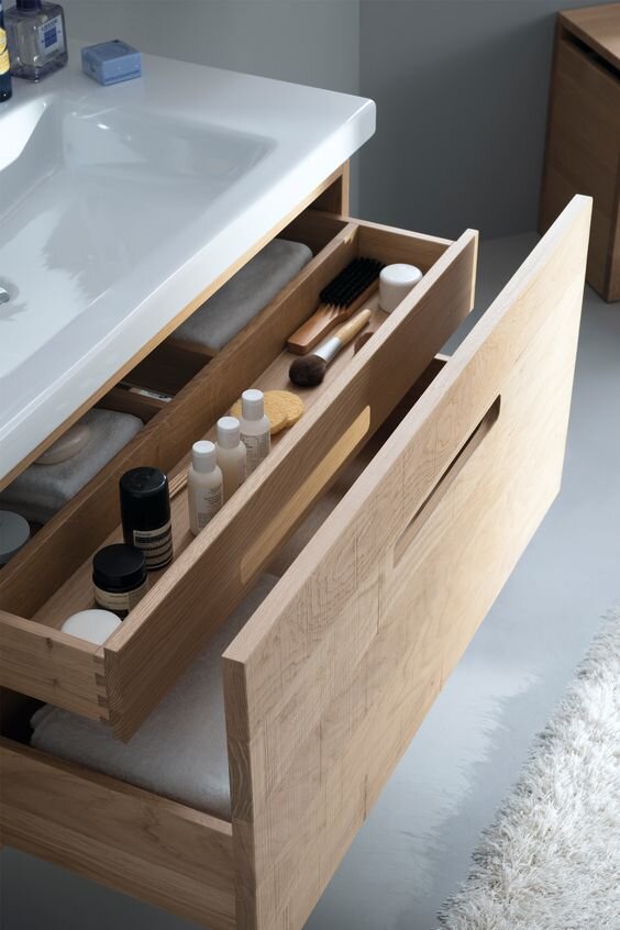 Используйте выдвижные полки в углах ванной комнаты. Они позволят разместить множество мелочей. Открытые полки