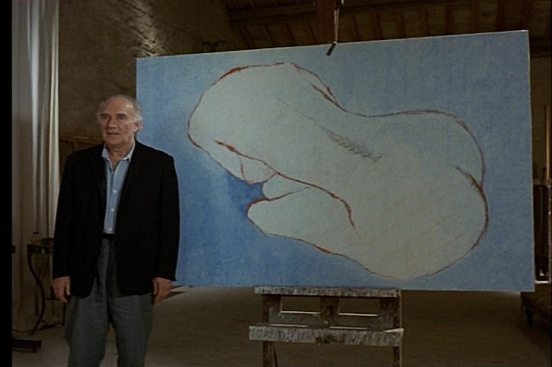 Помните, в "Очаровательной проказнице" Риветта - художник четыре часа рисует картину. А потом замуровывает ее в стену. И нам показывают только ее краешек, замазанный кроваво-красной краской. А потом для сравнения показывают другую картину - ту, что он нарисовал "для отмазки". Не гениальную. Вы можете ее видеть на этом фото. Голубенькая. Можно ли вообще показать гениальное произведение искусства?