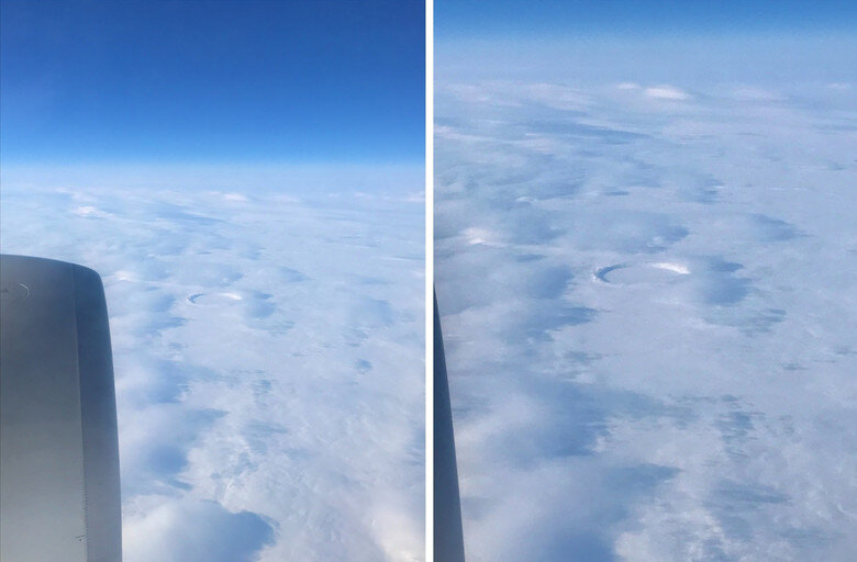 В прошлом году житель Канады, летевший в США запечатлел странное явление в облаках. Выглядит это как идеально круглое углубление в облаке, как будто что-то в форме блюдца садилось прямо на облако. Сам мужчина не смог найти логического объяснения этому явлению. Он отправил свою фотографию на уфологический сайт для того чтобы эксперты дали объяснение этому странному явлению. Исследователи сообщили, что это определённо выглядит как след от пролетевшего НЛО. Очень схоже со случаем в Чикаго в 2015 году, когда посетители и персонал аэропорта увидели как НЛО пролетел сквозь облако, оставив идеально круглое отверстие, которое оставалось на месте в течение 15 минут. Друзья, если Вам понравилось, то поставьте палец вверх и подпишитесь на канал. Спасибо за поддержку!