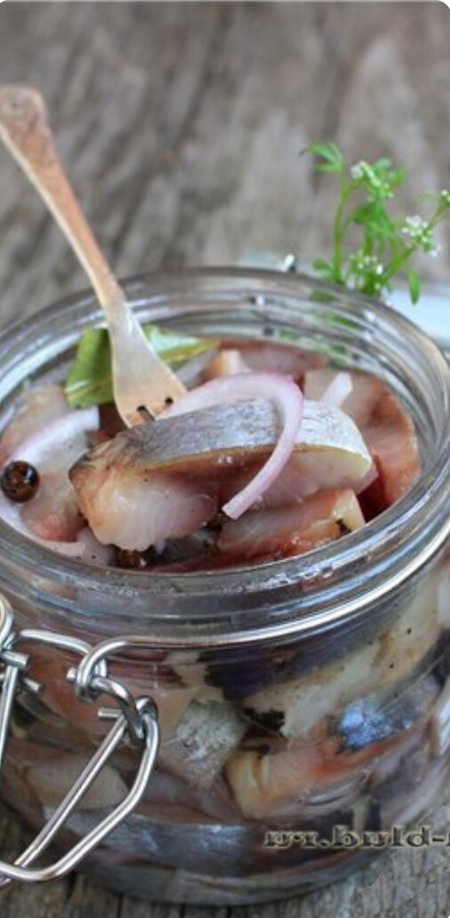 Ингредиенты: Сельдь малосольная - 1 кг Лук - 1 шт. Вода - 200 мл Уксус - 1 ст. л. Нужно взять баночку 300 - 350 мл. Режем лук кольцами. Смешиваем воду и уксус. Сельдь чистим, режем на кусочки. Нужно уложить слоями, сначала мы укла