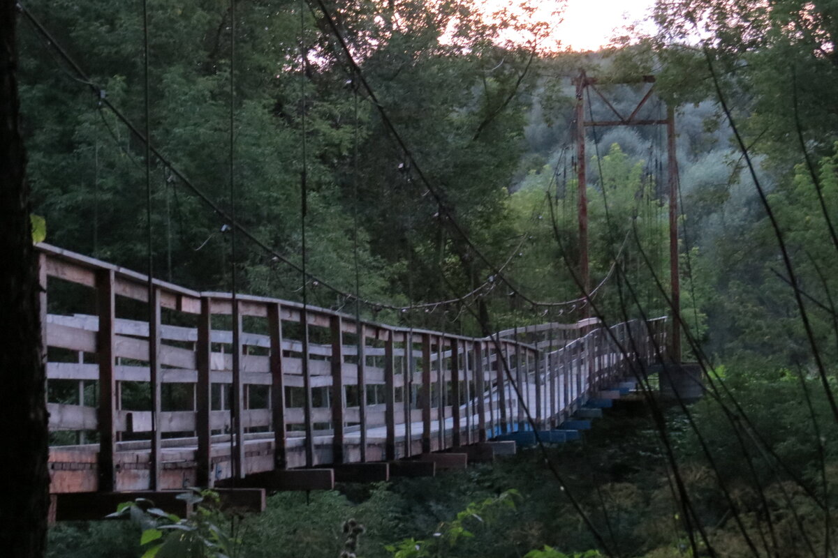 В Высокогорском районе Татарстана, в нескольких километрах от границы Казани, есть местная достопримечательность, о которой многие слышали, но мало кто её видел. Это подвесной пешеходный мост через реку Казанка. Про него можно найти информацию в сети, но она весьма скудная. Мост расположен неподалёку от санатория Крутушка. Но добраться до него, как выяснилось, непросто. Раз это мост, значит подойти к нему можно с обеих берегов Казанки: со стороны Крутушки и со стороны Кульсеитово. Я выбрал первый вариант и приехал в Крутушку. Проехал санаторий, заехал в посёлок, по максимуму добрался до берега Казанки. Но никакого моста не увидел. Там большая поляна, и на ней как раз проходил этно-фестиваль, там это частое явление... Попытался пойти вдоль берега, (а он там сильно заросший) влево, вправо - моста не видно. Пришлось брать языка. Как раз мимо пробегали трое мальчишек, на вид - местные, младшекласники. Спросил у них, не знают ли где пешеходный мост. На моё счастье они знали, но объяснить сл