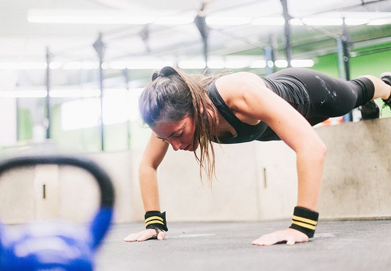 - отжимания – 15 повторов в круге. В кроссфите отжимания отличаются от обычных тем, что в нижней точке нужно касаться пола, причем на секунду лечь на него полностью, а руки и ноги оторвать от поверхности;