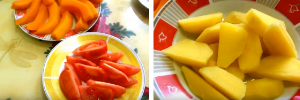 Этот рецепт очень легкий в приготовлении, гарнир получается вкусным и аппетитным. Запекается такое блюдо в духовке. Количество ингредиентов можете варьировать по своему вкусу, здесь это не принципиально. Ингредиенты: Приготовление блюда из тыквы. 1. Как всегда, начинаем приготовление блюда с тыквы. Этот овощ очистите от семечек и кожуры и нарежьте порционными дольками, толщиной не более 2 см. 2. Картофель для этого блюда нужно брать такой, который быстро готовится. Если же картошка «долгоиграющая», ее нужно предварительно отварить в подсоленной воде около 7-10 минут до полуготовности. Потому что тыква в духовке приготовится раньше, а пока картошка станет мягкой, тыква уже превратится в пюре. 3. Слегка отваренную картошку очистите и нарежьте на порционные кусочки, не слишком мелкие. 4. Помидоры нарежьте дольками, лук полукольцами. 5. Сложите в одну большую емкость все овощи, посолите их, поперчите и сдобрите специями. Также выдавите через пресс чеснок и пол