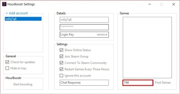 Как мы все знаем сейчас cs:go бесплатная и мы будем это использовать. Для начала нам понадобиться добавить на все аккаунты cs:go, затем качаем программу HourBoostr(https://github.com/Ezzpify/HourBoostr) и запускаем ее и крутим 100 часов в cs:go. Приступим к настройке, заходим и вводим логин, пароль и нажимаем «Add account».