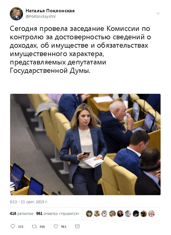 Комиссия Госдумы по контролю за достоверностью сведений о доходах решила провести проверку в отношении трех пока не названных депутатов от ЕдРо и «Справедливой России», заявила ее председатель Наталья Поклонская. По ее словам, на этой неделе запросы о проверке будут направлены в Росфинмониторинг, ФСБ и Генпрокуратуру. Об этом она вчера написала в своем Твиттере. "Сегодня провела заседание Комиссии по контролю за достоверностью сведений о доходах, об имуществе и обязательствах имущественного характера, представляемых депутатами Государственной Думы. Выслушав мои аргументы о необходимости проведения проверок надзорными и правоохранительными органами в отношении ряда депутатов, меня впервые поддержали члены комиссии. Теперь собранные и подготовленные мной материалы о возможных нарушениях антикоррупционного законодательства со стороны трёх депутатов будут направлены для проведения всесторонней проверки в Генеральную прокуратуру РФ, ФСБ РФ, Росфинмониторинг и др. компетентные органы. Мате