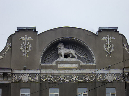 Льва на земном шаре окружают жезлы Меркурия – кадуцеи, его сандалии с крылышками, гирлянды из роз, маскароны львов. Как минимум 42 львиных головы на фасаде. Рекламная вывеска на фасаде проявлялась до 1960-х гг.