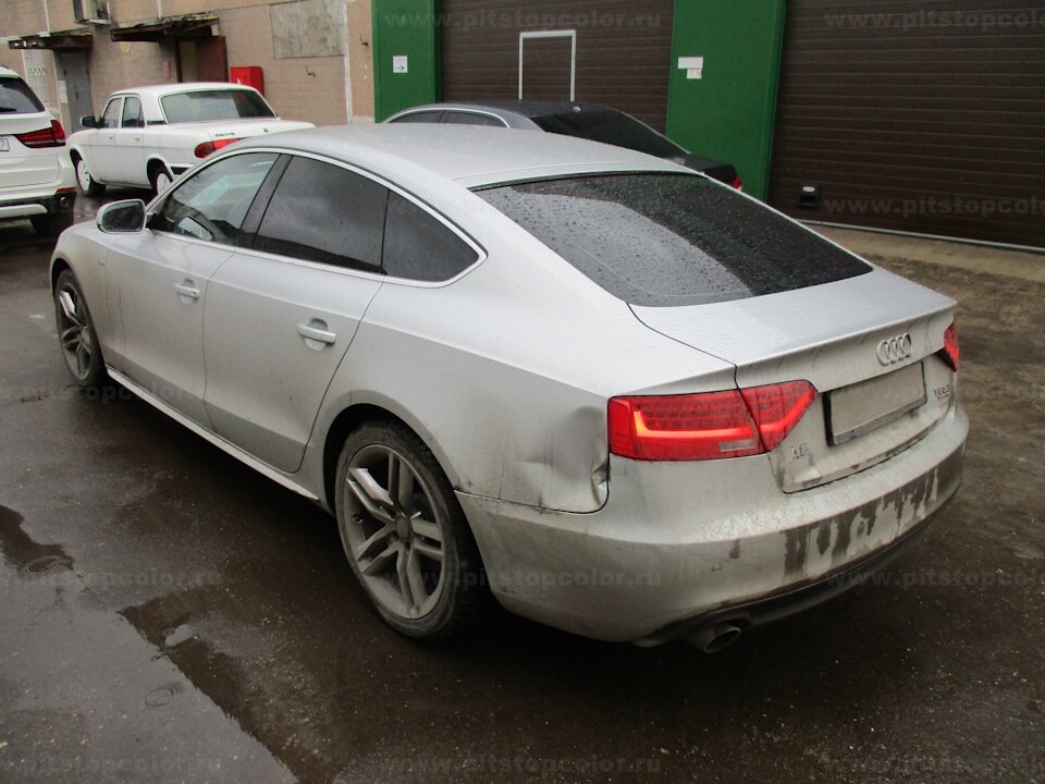 Предлагаем Вашему вниманию фотообзор по ремонту а/м Audi A5. Встречаются повреждения после ДТП, когда кажется, что бил либо ювелир, либо снайпер…)) Буквально два сантиметра в сторону могут стоить десятки тысяч рублей. У водителя Газели, ударившего эту Ауди А5, явно присутствовали навыки одного из этих "специалистов"…)) Глядя на наш случай, понятно, что несколько сантиметров правее и можно смело плюсовать стоимость нового бампера, фонаря, а возможно и серьёзный ремонт задней панели. В данном случае под "серьёзный" ремонт попало только заднее левое крыло. Задний бампер отделался небольшим задиром и царапинами, которые просто счистятся вместе с ЛКП, а что касается заднего левого фонаря, то повреждения обошли его стороной. Суппорт фонаря немного деформирован, его мы отремонтируем без окраски, а вот с задним левым крылом без споттера и молотков не обойтись, поэтому разбираем машину и готовим повреждённые зоны к кузовному ремонту. Прежде всего расчищаем зону от ЛКП и крепимся споттером. В