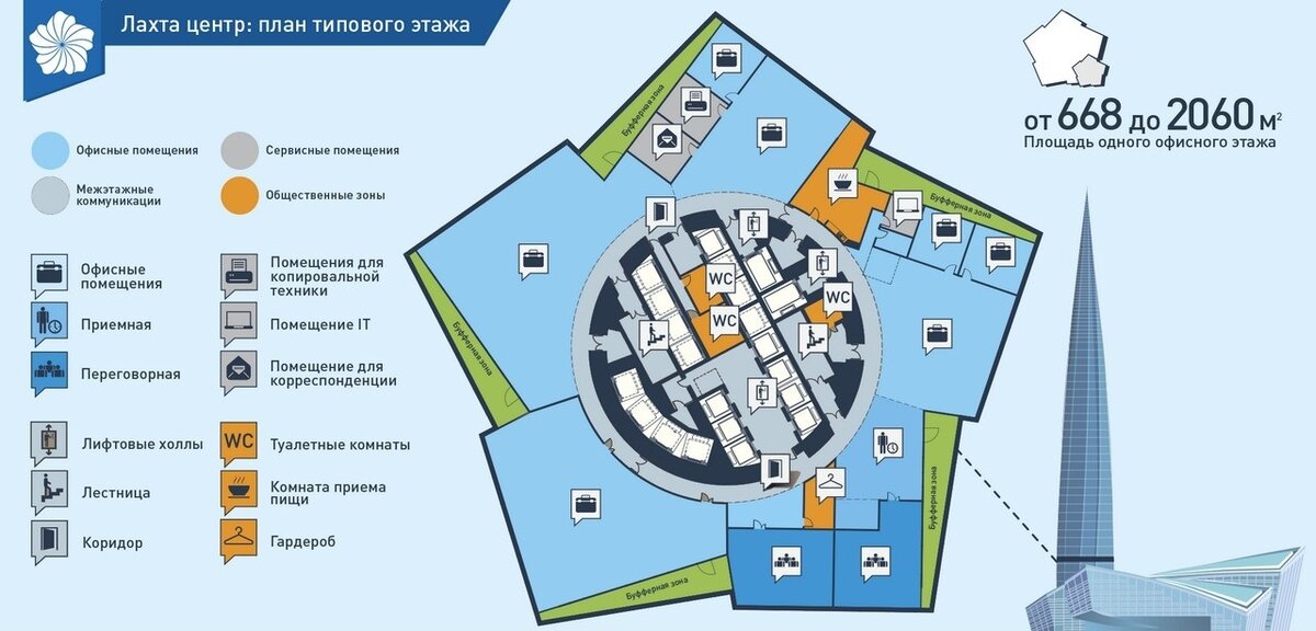 Во многих современных небоскребах форточек в привычном понимании просто нет. Микроклимат регулирует система вентиляции и кондиционирования. А то, что мы привыкли считать «окнами», на самом деле - элементы стеклянного фасада. Это - аналог стен, и открыть их никак не получится. Что же делать, если хочется все-таки утроить проветривание методом небольшого сквозняка? В самом высоком небоскребе Европы – башне Лахта Центра - в помощь системе искусственного микроклимата сделали технические клапаны на фасаде. Впрочем, и в этом случае вечные споры о том, открыть или закрыть форточку, тоже не уместны. Дело вот в чем. Технические клапаны расположены в особых местах. Форточки - в буферных зонах Здание Лахта Центра - небоскреб высотой 462 м - в горизонтальном разрезе состоит из пяти лепестков. В углах, между гранями лепестков, предусмотрены двойные фасады. Пространство между «нитками» фасадов — так называемые буферные зоны. Каждая такая буферная зона занимает по высоте сразу два этажа.