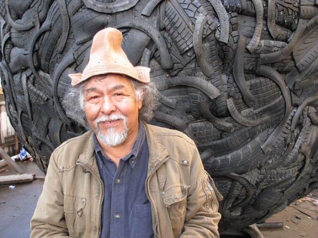 Памяти казахского скульптора Молдакула Нарымбетова репортаж о моем знакомстве с ним и его работами в 2011 году. ******************** За неприметным забором в одном из заброшенных уголков города Перми скрывается творческая мастерская казахского скульптора и художника Молдакула Нарымбетова. Молдакул известен своими скульптурами, изготовленными из старых покрышек. Его произведения уличного арта украшали собой не один город или фестиваль. По приглашению Музея современного искусства " PERMM" ("Речной") Молдакул уже больше месяца без перерыва работает над двумя скульптурами для города Перми. Когда узнаешь о работе художника по наслышке, кажется что ничего особенного в этом нет. Все мы знаем рекламу шин "Мишелин" и ее самодельные копии, лебедей и цветы на детских площадках и в цветниках, прочий незамысловатый паблик арт дворов хрущевских пятиэтажек и дачных участков. Но скульптуры Молдакула выполнены по особой, отточенной годами, технологии. Старые покрышки превращаются сначала в подобие кож
