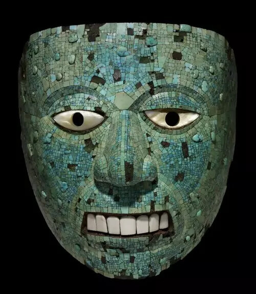 Считается, что поразительная бирюзовая маска в Британском музее в Лондоне представляет Xiuhtecuhtli, бога огня ацтеков, и относится к последнему столетию ацтекской империи, c. 1400-1521 гг. Она сделана из сотен мелких кусочков бирюзы, приклеенных к основанию из кедрового дерева, и должна была либо отождествлять бога в религиозных церемониях, либо носиться для изображения бога. Маска была почти наверняка частью сокровища, привезенного Эрнаном Кортесом и подаренным Карлу V. Маска имеет размер 16,5 см х 15,2 см и покрыта сотнями осколками(тессеры) бирюзы, которые были вырезаны и сформированы вручную, чтобы создать ощущение трехмерных особенностей человеческого лица. Тессера были прикреплены к маске из резной кедровой древесины с использованием сосновой смолы в качестве клея. Чтобы лучше представить форму лица, деревянная основа также была согнута.Внутренняя поверхность маски была окрашена красным гематитом. Глаза, брови, нос и рот оказываются с вырезанными с особой точностью. Различные о