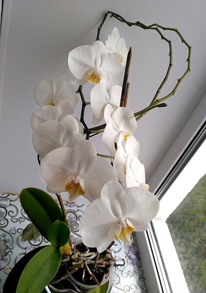 У нас орхидея цветёт уже целый год не переставая. Обычная орхидея, купленная что-то около 500 р., в обычном магазине. Дальнейший простейший рецепт проверен на собственном опыте... Предыстория После покупки какое-то время она ещё цвела по инерции :), но затем ей расхотелось. Хотя мы честно её поливали, увлажняли вокруг неё воздух и прочее и прочее... Цвет сбросила, основной стебель, на котором были цветы стал сохнуть, в результате засох окончательно и стал деревянным, пришлось отрезать. Осталась только пара-тройка листьев, ну и, полуживые корешки. Пошерстив интернет и начитавшись разнообразных рецептов с подкормками, пересаживаниями и освещениями (вплоть до фитоламп), для себя поняли, что заморачиваться с этим всем уж точно не будем. :) Выбрасывать полузасохший цветок не стали, а просто поставили горшок в ёмкость с обычной водой из-под крана. С таким расчётом, чтобы оставшиеся корешки всё время находились в воде. История Прошло какое-то время (какое, уже не помню), горшок так и стоял
