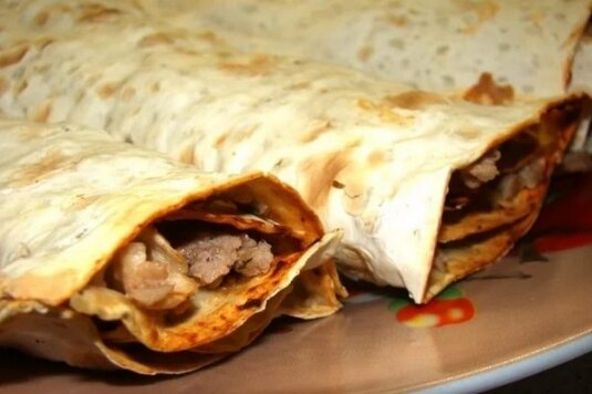 - Тонкий армянский лаваш положить на смазанный маслом или застеленный пергаментом противень. Смазать кетчупом, сверху – тонкий слой любого фарша с луком, специями, солью. Поставить в нагретую духовку, печь в течение пяти минут при температуре 175 градусов. В горячем виде скрутить лепешку в трубочку. Блюдо подать к бульону или к шурпе.