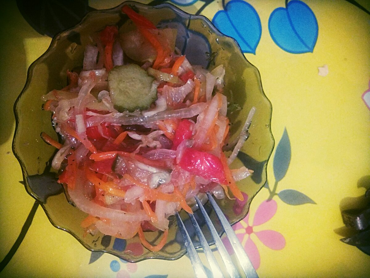 Изумительно вкусный салат, съедается моментально. Нам понадобится : Помидоры 3 кг Лук репчатый 3 кг Перец болгарский красный 3 кг Морковь 3 кг Капуста большой вилок Огурцы 1.5 кг Свежая зелень (укроп, петрушка) 200 грамм Чеснок 300 грамм Соль, перец чёрный горошек, уксус 9%, перец чёрный молотый Масло растительное 300 мл Аспирин Овощи тщательно промыть, очистить. Помидоры режем дольками, лук нарезать полукольцами, морковь нашинковать на корейской терке. Перец порезать соломкой, огурцы небольшими полукольцами. Зелень мелко порубить. Чеснок натереть на мелкой терке. Овощи складываем в глубокую посуду, соли, перчим, тщательно перемешиваем. Баночки чисто вымыть, желательно брать 0.5 или 0.7 литровые, можно 1 литр. На дно банки положить по одной таблетке аспирина, несколько штук чёрного перца горошком. Овощную смесь плотно утрамбовываем в банки, сверху долить образовавшийся сок от овощей. Банки прикрыть крышками, положить сверху груз, поставить стерилизовать.