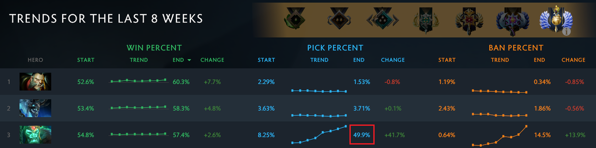 Как видно на картинке Wraith King имеет пикрейт 49.9% и это означает, что он появляется в каждой второй игре на высоких рангах. Также он имеет довольно много банов - в 14.5% матчей он банится, оно и не удивительно, ведь у него винрейт 57.4%. Большое влияние на паблики, конечно же, оказал The International, где этот герой пикался довольно часто и показывал себя с хорошей стороны.