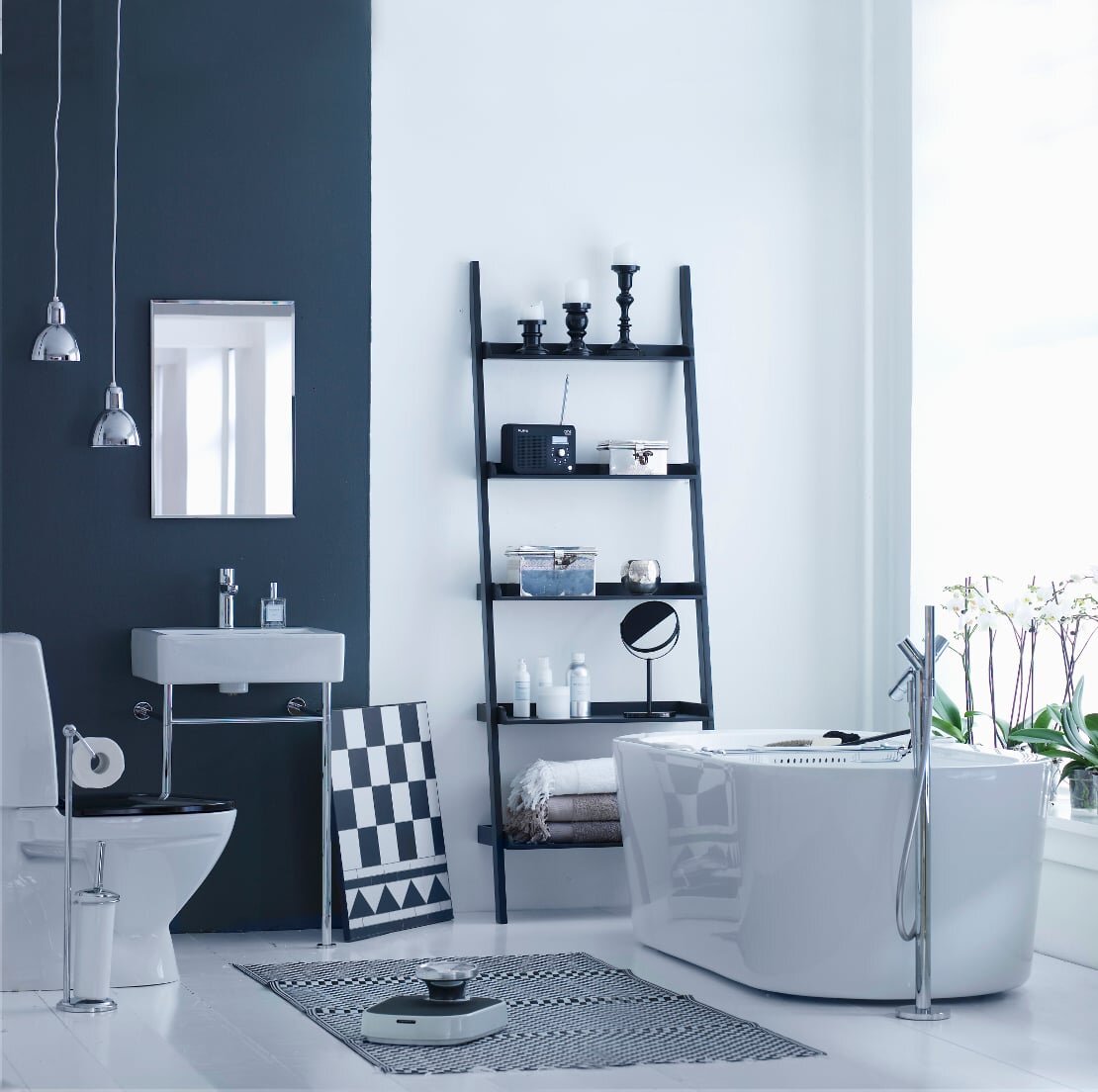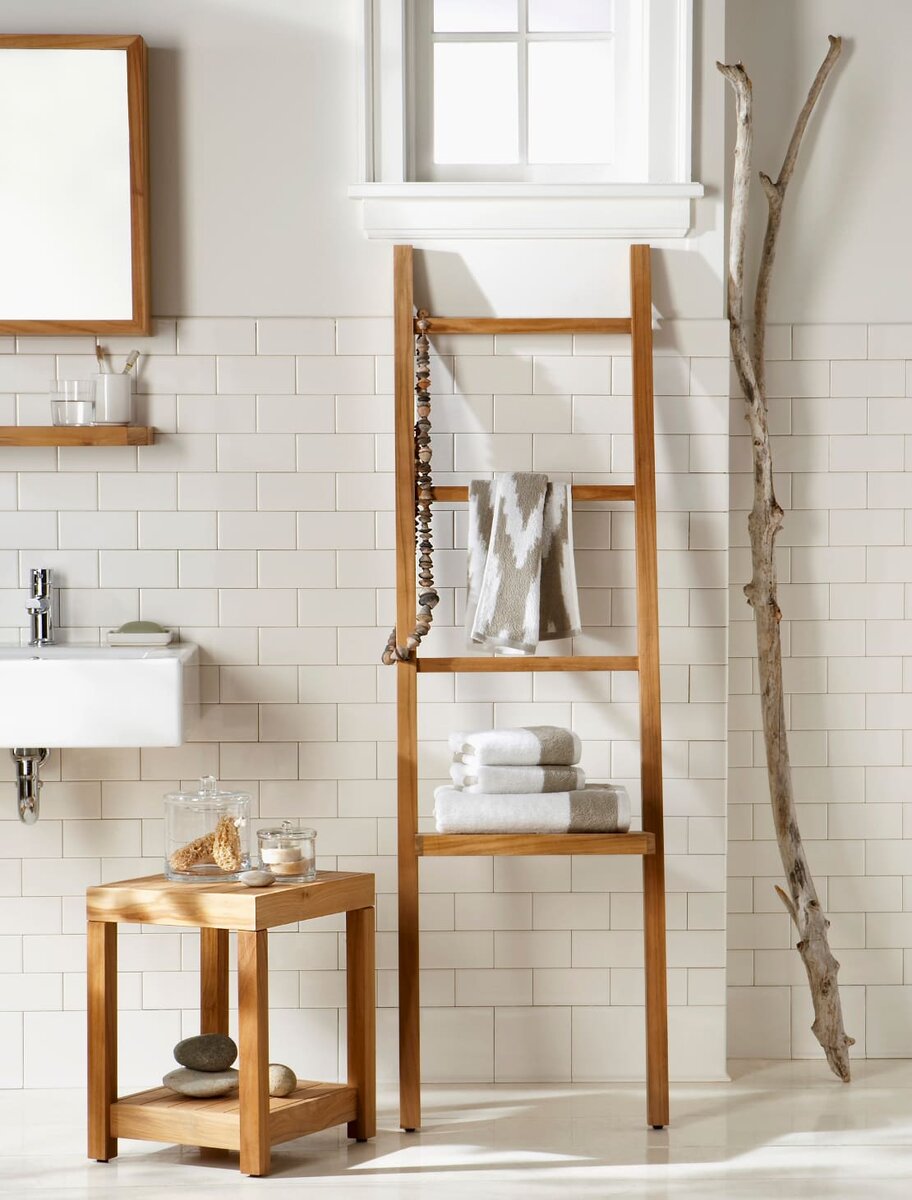 Вы ищете способы, как обновить ванную комнату без больших затрат? Мы предлагаем вам шесть простых и оригинальных идей для ванной комнаты, с помощью которых вы сможете изменить интерьер всего за несколько минут! Необычные полки для полотенец Забудьте классические стеллажи и крючки и сделайте выбор в пользу необычного решения. Например, деревянные или металлические стремянки могут служить простой и стильной заменой полотенцесушителю. Они смотрятся просто, лаконично и современно, не занимают много места, а также позволяют размещать не только полотенца, но и другие аксессуары на ступенях. Попробуйте покрасить стремянку в яркий цвет, чтобы создать в ванной красочный акцент. Другой вариант для хранения аксессуаров — разноцветные сумочки из текстиля или пластика, которые вешаются на обратной стороне двери и отлично подходят для размещения косметики и небольших аксессуаров. Больше цвета Самый простой способ изменить внешний вид ванной — сменить цветовое решение текстиля: замените