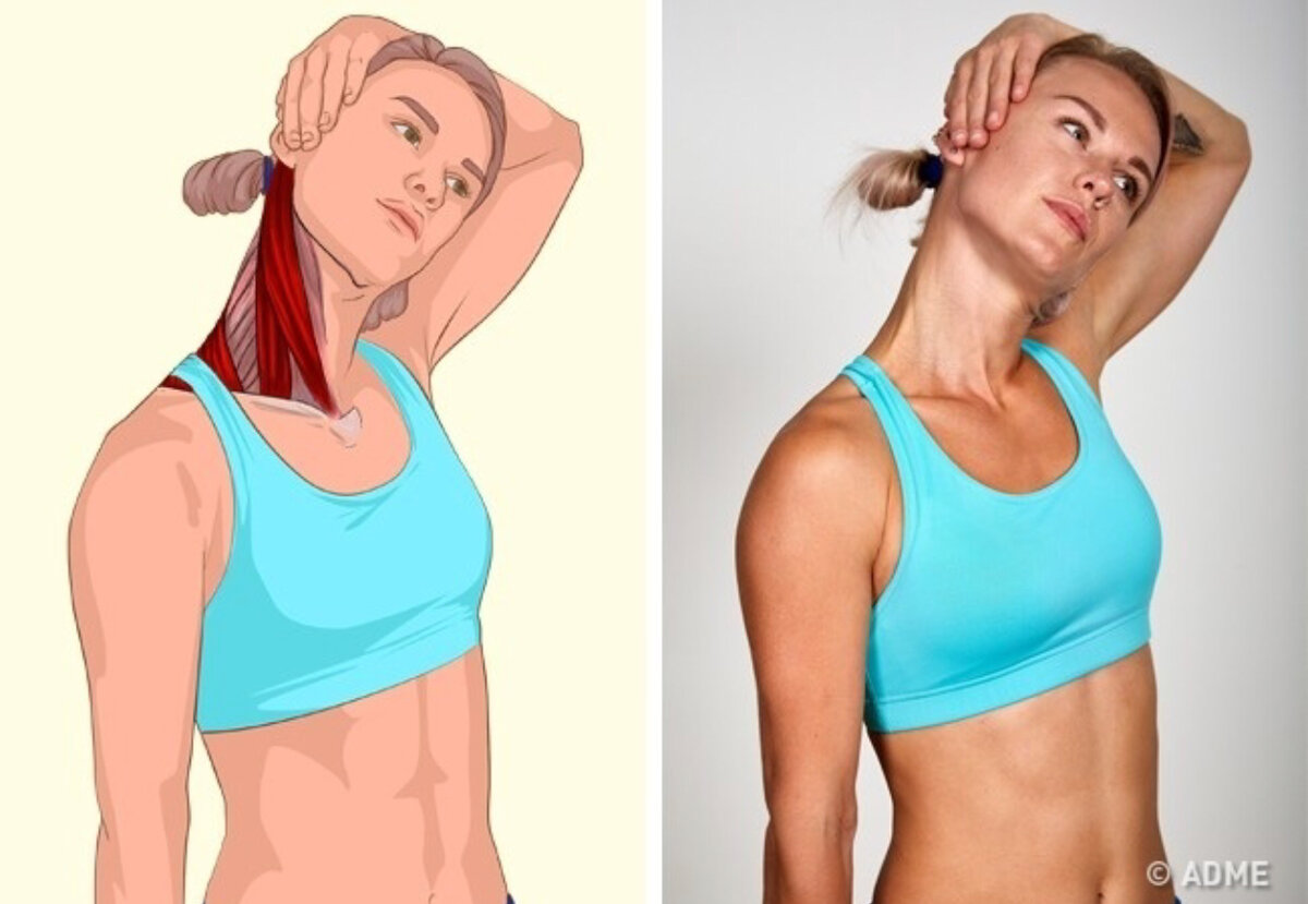 Растягиваться полезно всем: и тем, кто активно занимается спортом, и тем, кто ведет сидячий образ жизни. Сегодня мы хотели бы поделиться с вами замечательным комплексом упражнений, который разработан испанским фитнес-тренером. Выполняя ежедневно (или по возможности, но регулярно) эту программу, вы сможете поддерживать свое тело в тонусе постоянно. И разбудите свои мышцы! Важное замечание: во время выполнения упражнений следите за дыханием. Удерживайте тело в предложенном положении 10-30 секунд. И помните, что вы не должны испытывать болевых ощущений. Мышцы шеи задействованные мышцы: грудино-ключично-сосцевидная;положите руки на бедра, выпрямите спину и начинайте осторожно наклонять голову назад (можете помочь себе руками, положив ладони на лоб). Растяжка боковых сгибателей шеизадействованные мышцы: грудино-ключично-сосцевидная и верхняя трапециевидная;в положении сидя, выпрямив спину и помогая себе левой рукой, наклоните голову влево, стараясь ухом коснуться плеча; повторите упражнени