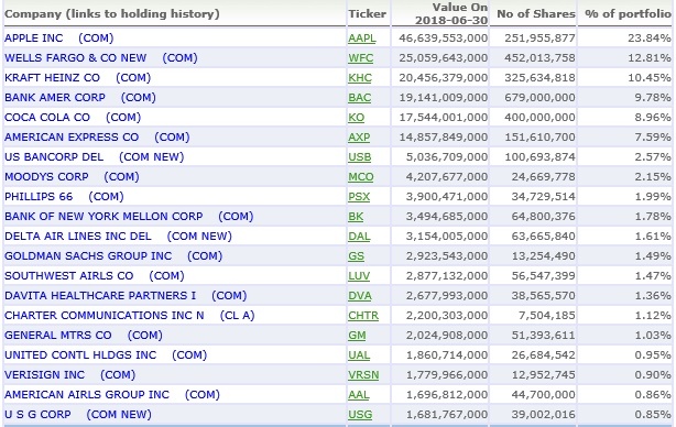 Здравствуйте, друзья! Как я уже рассказывал, я перешел от инвестирования по стратегии "Рост и дивиденды" к высокодивидендной стратегии в связи со скорым достижением финансовых целей. Но от акций Apple я не смог избавиться. Уж больно хороша эта компания. Впрочем, кое-кто из читателей не согласен, считая Apple бесперспективной компанией. По их прогнозу на акции Apple в 2019 году особой отдачи ждать не стоит. После презентации новых iPhone один из клиентов даже усомнился в необходимости покупать акции Apple и инвестировать в них деньги. Давайте разберемся в этой любопытной ситуации. Но начну с напоминания о том, что в портфеле Уоррена Баффета Apple занимает 25%! Речь идет именно о портфеле Уоррена Баффета, а не о доле Баффета в капитале Apple. Это разные вещи и иногда возникает непонимание. Смотрим на состав портфеля Berkshire Hathaway, делим долю Apple на общую капитализацию и получаем итог. Почему же Баффет покупает акции Эппл в таком огромном количестве? Все очень просто и по