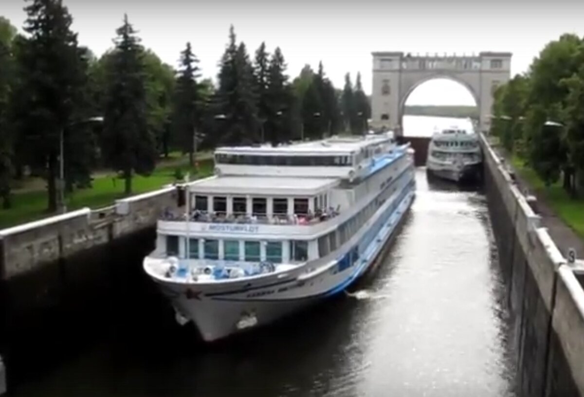Шлюзование двух круизных теплоходов в Угличском шлюзе