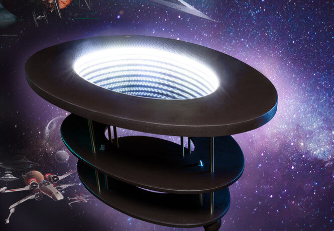 Когда гости хотят еще развлечений, а кошка и Wi-Fi уже приелись, включай им стол. Светящийся колодец введет их в транс, и они забудут обо всем до ухода. А если смотреть на стол долго, он сработает как портал и перенесет в точку сборки. Итак, как сделать такое своими руками. 01 Эффект светящегося колодца возникает, если светодиоды поместить между двумя зеркалами. Вокруг этого принципа можно собирать стол-колодец в самых разных версиях. 02 Три листа девятислойной фанеры, дрель с разными коронками, мягкая шкурка, набор кистей, шпатлевка, краска, клей, немного фанатизма — базовый набор этого рукоделия. 03 Одно зеркало должно быть полупрозрачным, оно будет лежать сверху. Как и отверстия в фанере, резку стекол лучше заказывать у специально обученных и оснащенных людей. 04 Нижние листы фанеры соединяют шпильками на болтах. На шпильку можно надеть гайку, вырезать в фанере для нее полость и после стыковки залить гайку эпоксидной смолой. 05 Моментальным суперклеем гораздо проще приклеить к лист