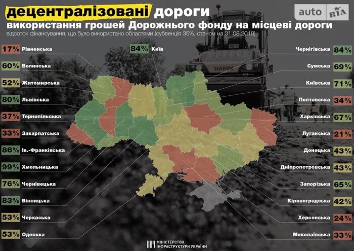 Рейтинг використання коштів з Дорожнього фонду України оприлюднив міністр інфраструктури Володимир Омелян. Рівненська, Миколаївська, Херсонська і ще ряд областей України залишаються без хороших доріг – причому, схоже, добровільно. Справа зовсім не у відсутності фінансування, як може здатися з ситуації. Міністр інфраструктури Володимир Омелян раніше відзначав, що Державний Дорожній фонд працює успішно і передбачає захищене фінансування галузі в 2018 році на рівні 32 млрд гривень. Проте, багато обласних центрів виділені кошти просто … не використовують. Міністр опублікував на своїй сторінці в Facebook інфографіку, на якій чітко видно, в яких саме областях не поспішають розлучатися з казенними грошима. Найменше виділених на дороги коштів (всього 17%) витратили в Рівненській області. А лідером рейтингу (в хорошому сенсі слова) стала Хмельницька область – тут на ремонти вже витрачено 99% коштів Дорожнього фонду, передбачених на 2018 рік. Цікаво, що скажуть про дороги Хмельнич