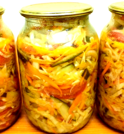 Приветствую Вас дорогие читатели! Рада что посетили мой канал. Настало время зимних заготовок, и я хочу поделиться некоторыми секретами и вкусными рецептами , которые в холодную зиму украсят Ваш стол или просто будут хорошей закуской к ужину! И так, начнем с самого простого по моему мнению рецепта, и по времени не долгого по приготовлению, Салат- В доль по огороду) Я сделала расчет продуктов на четыре литровых банки: берем всех овощей по одному килограмму, свежую морковь отвариваем , лук репчатый , капуста свежая белокочанная, перец болгарский сладкий желательно красного цвета, хорошо спелые томаты, огурцы ( не сильно переспелые) . Далее все овощи мелко измельчаем, некоторые можно пропустить через кухонный комбайн. Укладываем в большую кастрюлю , льем в овощи два стакана растительного масла, солим 2 столовые ложки, добавляем сахар один стакан, все тщательно перемешиваем и туда же добавляем две столовые ложки уксуса и еще раз все тщательно перемешиваем и ставим