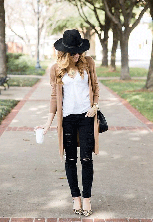 Черные джинсы - вещь, которая определенно есть у каждой девушки. Их универсальность может дать вам множество вариантов для повседневного образа. Комбинировать можно как угодно. Черный сочетается практически со всем спектром оттенков. Черный является цветом, который скроет все ваши недостатки. А полностью «черный» образ визуально удлинит ваш силуэт, благодаря чему вы будете выглядеть стройнее. В осенне-зимний период такие джинсы являются настоящей находкой. Можно скомбинировать образ, который будет удобен и выглядеть будет стильно. Нужно вдохновение? Тогда ловите подборку из семи идей для осеннего образа с черными джинсами. Белая майка + черные джинсы + коричневый кардиган + леопардовые туфли. Полосатая футболка + черные джинсы + черный бомбер + белые кроссовки. Серый свитер в белый горошек + черные джинсы + черный шарф + черные сапоги. Черный свитер + черные джинсы + бежевое пальто + бежевые туфли. Зеленая рубашка + черные джинсы + черная куртка + зеленые ботинки. Черные джинсы