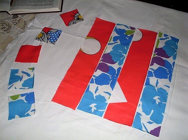 Рассмотрим орнамент "Шахматная доска", он шьется из двух видов тканей. Такой орнамент можно шить не разрезая ткань на квадраты, а кроить сразу полосами, рассчитав длину и ширину полос. Я раскроила две красные и две синие полосы шириной 4 см(в готовом виде) + 2 см(припуски на швы) и длиной 6 см х n ( n - количество лоскутов в ряду).я беру 5, длина всех полос будет равна 30 см. (6х5 см.=30) Складываем красную и синюю полосы лицом внутрь, выравниваем срезы, скалываем булавками перпендикулярно будущему шву через 8-10 см. Линию шва прочерчиваем на расстоянии 0,75-1 см. от среза, и строчим прямо по булавкам. Шов проутюжить с изнанки, а потом с лицевой стороны. Затем разрезаем двойные полосы на 5 фрагментов по 6 см. И дополнительно раскроить 3 синих квадрата и 2 красных размером 6х6 см. Все фрагменты для шитья готовы. Сшиваем горизонтальные полосы и пришиваем дополнительные квадраты. Соединяем полосы между собой совмещая швы, отмечаем линию шва и прошиваем, утюжим все швы