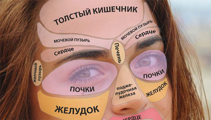 Оказывается, по коже лица на разных участках можно судить о состоянии внутренних органов. Когда внутри нас возникают какие-то нарушения, то на соответствующих внутренним органам местах лица проявляются дефекты в виде сыпи, отеков, раздражений итд. Итак, каким органам соответствуют области лица: Лоб - тонкий кишечник. Края лба - толстый кишечник. Верх лба возле волос - мочевой пузырь. Виски - селезенка. Брови - сердце. Переносица - печень. Верхняя часть носа - поджелудочная железа. Середина носа - желудок. Кончик носа - сердце. Ноздри - бронхи. Под глазами - у мужчин почки, у женщин почки и яичники. Левый глаз - селезенка и поджелудочная железа. Правый глаз - желчный пузырь и печень. Щеки сбоку - легкие. Щеки у носа - желудок. Рот - пищеварение. Верхняя губа внутри - желудок. Верхняя губа снаружи - сердце. Нижняя губа внутри - тонкий кишечник. Нижняя губа снаружи - толстый кишечник. Уголки губ - двенадцатиперстная кишка. Вокруг рта - половые органы. Подбородок - органы малого таза.