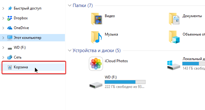 Возвращаем корзину на боковую панель проводника Windows 10