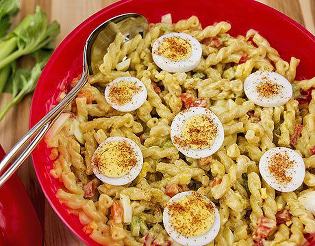 Довольно интересно должно получиться, если яйца размять (вилкой), чтоб получилась мелкая крошка. Далее смешиваем с отварными макаронами и брынзой (предварительно нарезанной кубиками). Вместо брынзы можно использовать тёртый сыр. Добавить чеснока и мелко нарезанный базилик. Заправляем всё это дело майонезом, добавляем соль, перец и перемешиваем. Используемые ингредиенты: Яйца вареные – 5 шт., Макароны отварные (перья, бантики или ракушки) – 300 г, Брынза или тертый сыр – 200 г, Чеснок – 1-2 зубчика, Базилик свежий – 8-10 листиков, Майонез – по вкусу, Соль, черный молотый перец – по вкусу. Лучше подавать как закуску или гарнир к мясу птицы.