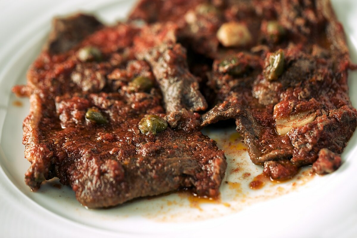 Meat a la pizzaiola, это не что иное, как мясо в соусе ... а-ля-пицца. Есть также помидоры и травы, которые можно найти в этом популярном итальянском блюде. В дополнение к говядине вы также можете приготовить свинину (например, вырезку или свинину) или мясо индейки. Ингредиенты (для 4 человек): 4 ломтика говяжьего стейка, предпочтительно бифштекса или антрекота толщиной около 1-1,5 см (по одному на человека) 3-4 не слишком большие зубчики чеснока, 0,75-1 литра томатов соль, томатного пюре , перец и щепотка сахара для вкуса ваших любимых трав (например, базилик, орегано) - растительное масло необязательно: каперсы - около 1 столовой ложки. Способ приготовления: Разогрейте масло или оливковое масло в сковородке. Обжарьте стейки с каждой стороны в течение 2-3 минут. присыпать солью и перцем во время жарки. В то время как они жарят, томатное пюре смешивают в миске с чесноком, зеленью, солью и перцем, измельченными помидорами, и щепоткой сахара (и, необязательно, 1 столовую