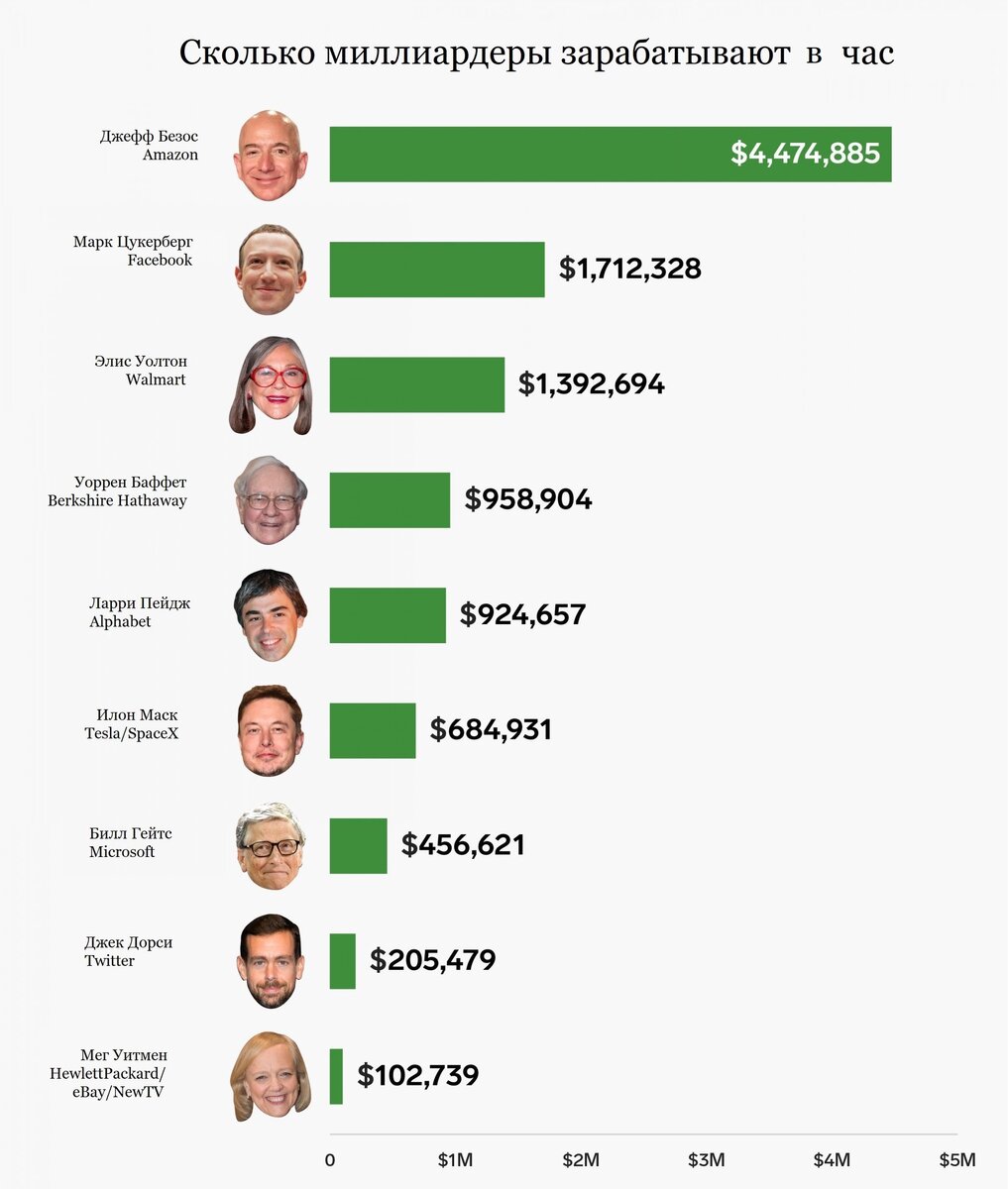 Ни для кого не секрет, что сильные мира сего зарабатывают баснословные суммы. Но о каких именно деньгах идет речь? Больше интересного о знаменитостях на hype.ru От СЕО и технологических миллиардеров до "селебритиз" — ресурс Businessinsider.de подсчитал, какие суммы зарабатывают в час 16 богатейших людей в США. Результаты оказались, мягко говоря, ошеломляющими. За основу расчетов использовалась информация о годовой прибыли и активах на основе оценок Forbes. Доходы определяли путем разницы между прибылью прошлого и текущего годов (ежегодно публикуемые в списках самых богатых людей в мире). Полученные суммы после поделили на 8760 (именно столько часов содержится в году). Что же получилось? Джефф Безос, Марк Цукерберг и Элис Уолтон зарабатывают более 1 млн долларов ежечасно. Безос зарабатывает больше всех — $4 474 885. Остальные шесть человек в списке зарабатывают шестизначные суммы. Уоррен Баффет, к примеру, "кладёт в свой кошелёк" $958 тысяч ежечасно. В середине рейтинга находится Ларр