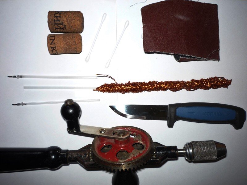 В коментариях меня попросили написать блог про изготовление такой мега-снасти как мини-бомбарда для ультралайтового спиннинга. Хотя мне казалось, что о процессе изготовления сего чуда можно было судить по его внешнему виду. :) К тому же у меня своя технология, наипростейшая, немного отличная от того, что пишут в интернетах и снимают в Ю-тюбах. :) Изготовление вместе с фотографированием заняло меньше часа. В этот раз я сделал бомбарду еще меньше предыдущих. Те были из стержней для ручки. В этот раз в качестве центральной трубочки я взял гигиенические палочки. Из материалов нам понадобятся: Инструментов тоже самый минимум: Отрезаем нужное количество пробки. Сверлим в ней центральное отверстие для трубочки. Ножом придаем грубую форму Наждачкой обтачиваем пробку больше для эстетического эффекта. :) Если необходимо (а чаще да, чем нет :)) подгружаем переднюю (короткую) часть бомбарды проволокой. Чтобы проволока не соскользнула с одной стороны она будет ограничена пробкой, а с другой, нагрев