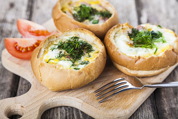 Порадуйте себя и близких таким необычным завтраком. Яичница в булочке готовится несложно, а получается очень вкусно и непривычно. Ингредиенты: 3 круглые булочки 3 куриных яйца 150 г. ветчины 30 г. сливочного масла 3 ст.ложки тертого сыра свежая зелень соль У булочек вырезаем середину и кладем вниз по небольшому кусочку сливочного масла. Ветчину нарезаем тонкой соломкой и кладем поверх масла. В каждую булочку разбиваем по одному яйцу. Разогреваем духовку до 200 градусов и запекаем булочки 5 минут. Через 5 минут посыпаем сверху тертым сыром, духовку ставим на 180 градусов и выпекаем еще 15 минут. Наш завтрак готов. Раскладываем по тарелкам и посыпаем мелко нарезанной зеленью. Приятного аппетита! Если вам понравился рецепт поставьте лайк! Буду очень благодарна! Подписывайтесь на мой канал, что бы не пропустить новые рецепты!
