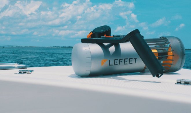 LeFeet S1 пополнил ряды подводных скутеров, где уже хорошо зарекомендовали себя Trident, WhiteShark MIX и AquaJet H2. Основа S1 – 550-ваттный электродвигатель из алюминия, который может перевозить дайвера со скоростью 6 км/ч. К нему крепится подвижная металлическая планка, на которую при необходимости устанавливаются различные модули для беспроводного управления. За скутер можно держаться одной или двумя руками, также предусмотрена спаренная модель, состоящая из двух двигателей с ручками между ними. Используя дополнительный комплект, можно установить силовой агрегат на подводную часть обычного каяка. Дроссельная заслонка, чувствительная к перепадам давления, дает возможность непрерывно регулировать скорость вращения, что отличает S1 от других скутеров, имеющих всего две переключаемых вручную скорости. Источник питания скутера – литиевая батарея, обеспечивающая запас хода в течение 1 часа со скоростью 3 км/ч. При максимальной скорости время движения сокращается до получаса. Подзарядка