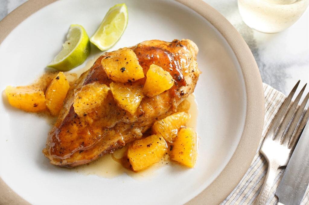Куриные окорочка являются наименее полезными частями курицы (много калорий и мало белка), но самыми любимыми и доступными. Поэтому сегодня я поделюсь очень легким рецептом приготовления окорочков с томатами и апельсином.