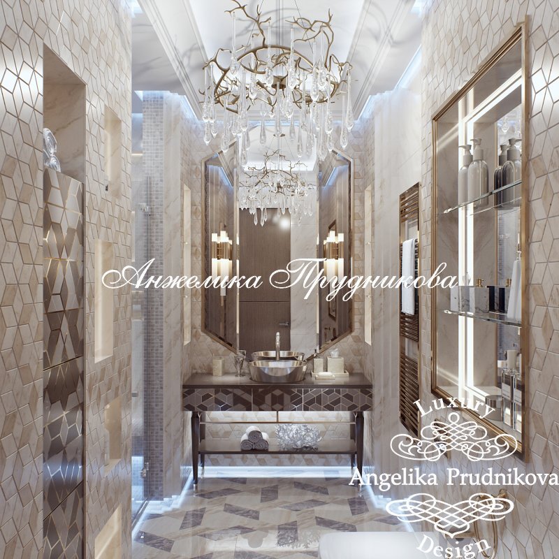 В умывальной зоне внимание привлекает оригинальное восьмиугольное зеркало, дополненное лаконичными парными бра. Оно прекрасно сочетается со сделанным на заказ столиком и хромированной раковиной. А вот душевую, оформленную мелкой каменной мозаикой, авторы проекта сделали максимально незаметной. Роскошная люстра в виде красиво изогнутой золотистой ветки с длинными хрустальными подвесками привносит в интерьер природные нотки и является очень оригинальным декораторским решением. Еще одна находка – подсвеченные светодиодами ниши с обеих сторон от душевой. Они отлично подходят для хранения аксессуаров и банных мелочей, а их подсветка создает романтическое настроение. Полная фот