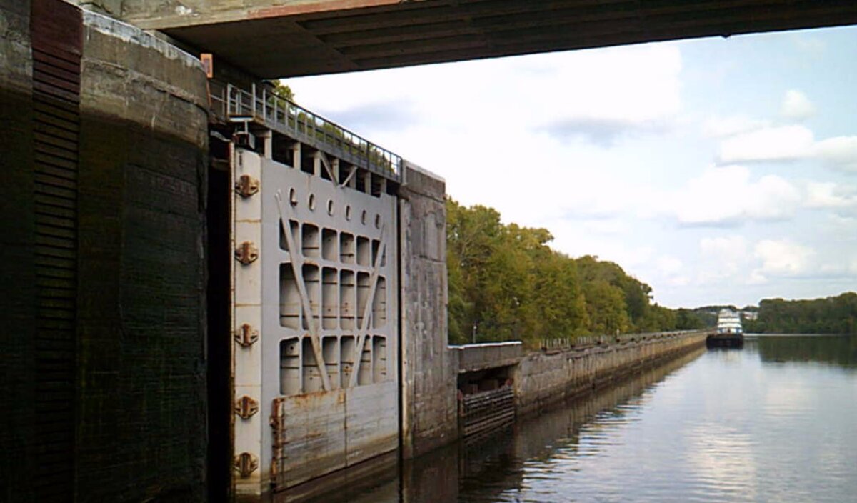 2018 год. Круизный теплоход выходит из шлюза и проходит мимо ожидающей шлюзования баржи.