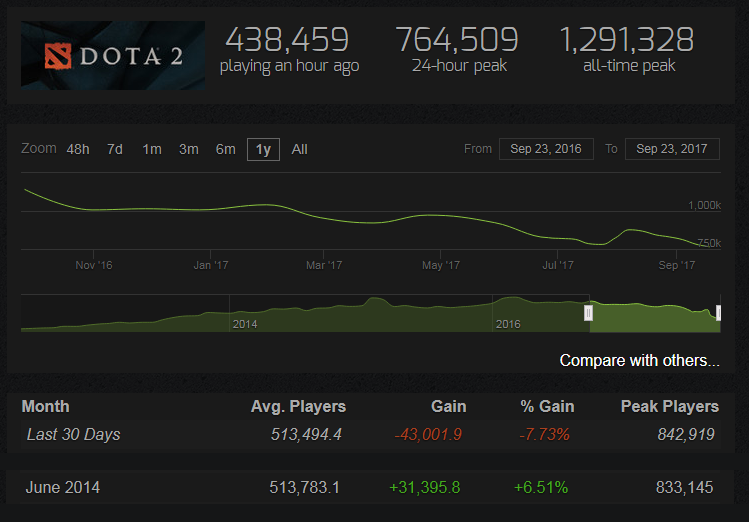 В данный момент популярность игры Dota 2 падает в стремительных значениях! Из-за чего это происходит? Или какая другая игра переманивает пользователей игры Dota2? Давайте разбираться! Число активных пользователей Dota 2 в 2018 году спустилось на столько, что его можно сравнить с уровнем 2014 годом и продолжает снижаться! В данный момент игра теряет не 0.1-0.3% игроков, а целых 4-6%. С 26 августа по 29 августа был замечен высокий скачок отрицательных обзоров на игру Dota 2. Как сообщают профессиональные игроки, игре мешает не только серьёзные геймплейные проблемы, но и высокий скачёт популярности игры PUBG! В 2017 году была подобная ситуация, игроки стремительно уходили из изры Dota 2 и другие игры как: PUBG и CS:GO.Но за последние 2 месяца в Dota 2 произошел скачек пользователей до 600 тыс. игроков . Скорее всего, этот скачек был вызван выпуском The International 2018 . Вот уже как несколько дней закончился The International 2018 . Сможет ли Dota 2 удержать своих пользо