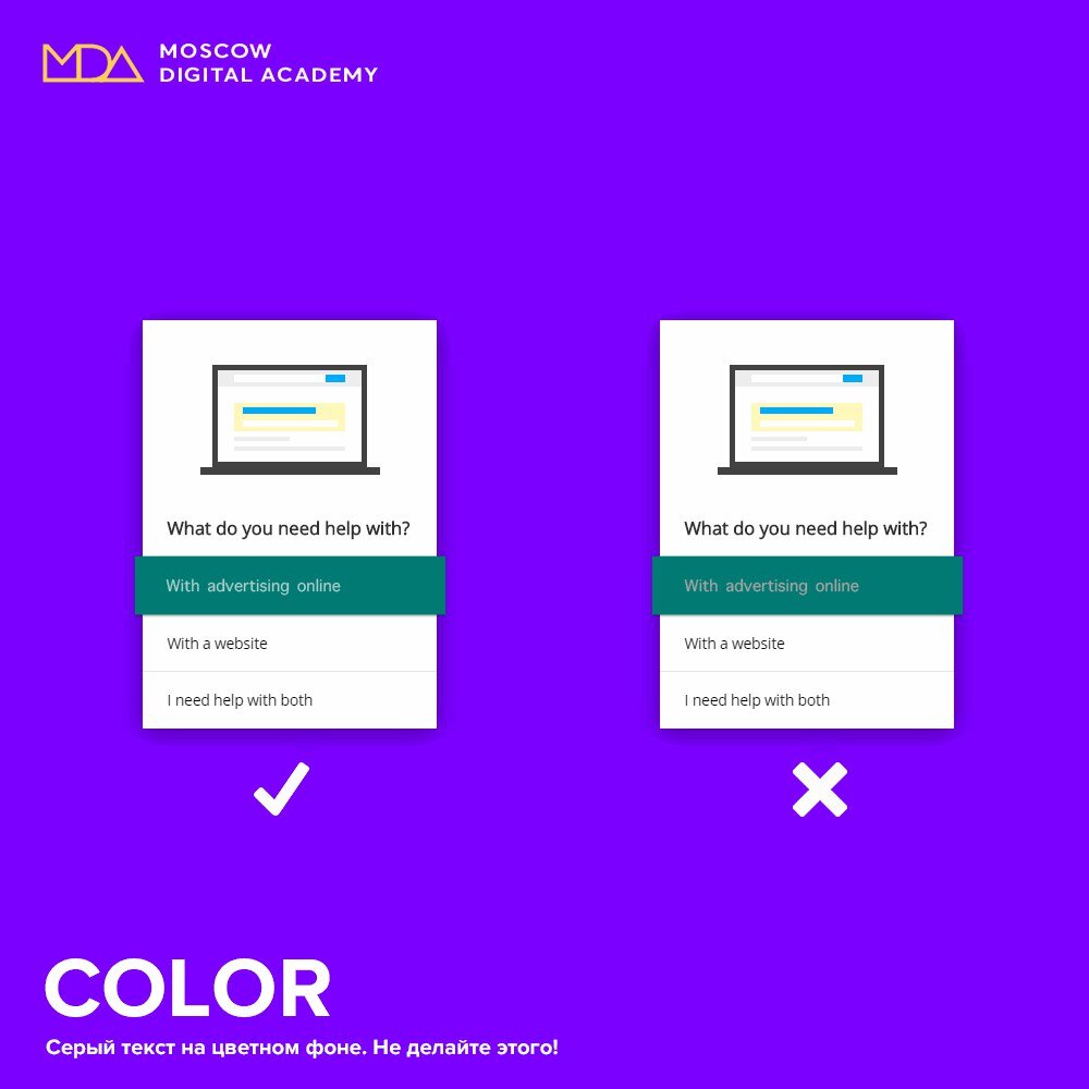 2. Выбрать вручную оттенок из фона. Это способ работает лучше, чем уменьшение непрозрачности. Когда фон — это изображение или рисунок, прозрачный текст получится размытым. Выберите цвет, который имеет тот же оттенок, что и фон, корректируя насыщенность и яркость, пока он не будет выглядеть идеально. Еще больше полезной информации о digital сфере вы сможете узнать на бесплатном вводном уроке, который пройдет в Москве 21 сентября и 23 сентября в Санкт-Петербурге.