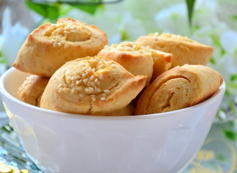 Хрустящее, воздушное и нежное печенье, займет свое место на вашем столе. Необходимые продукты: 1 стакан муки, 2 плавленых сырка по 100 грамм, 80 грамм сливочного масла, одно яйцо, 2 ст.л. молока, 0.5 ч.л. соли, 1 ч.л. сахара, 1 ч.л. разрыхлителя. Начинаем готовить. Плавленый сыр натираем на терке. В миску кладем натертый сыр, добавляем яйцо, растопленное сливочное масло, соль и сахар, все тщательно перемешиваем. Муку соединяем с разрыхлителем и добавляем в сырную смесь. Замешиваем тесто, если муки мало еще чуть-чуть добавляем, тесто не должно быть липким. Раскатываем тесто в один прямоугольник, который разрезаем на две равные части. Каждую часть сворачиваем рулетом и нарезаем на кусочки толщиной примерно 1 см. Противень застилаем бумагой для выпечки, которую смазываем маслом, на нее выкладываем наше печенье, каждое печенье смазываем сверху молоком и присыпаем по вкусу кунжутом, маком или сушеными травами. Выпекаем 15 минут в разогретой до 180 градусов духовке. Приятного аппетита. Д