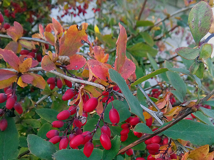 Плоды - овальчики, цветом темно-красным, вкус с кислинкой, выросли на деревце у садовой тропинки Барбарис обыкновенный - колючий кустарник из семейства барбарисовых растений, вырастает высотой до 2,5 метра. Растет в садах, возле домов, можно вырастить красивую живую изгородь, придавая определенную форму кустам. Плоды овальные, пурпурного цвета, имеют кисловатый вкус. Ягоды содержат аскорбиновую, яблочную кислоту, пектин, дубильные, красящие вещества и др. Плоды используют для приготовления варенья, киселя, пастилы, желе, сока. Полакомившись плодами барбариса, обязательно прополощите рот, чтобы сохранить эмаль зубов. Ягоды сохраняют витамины в сушеном виде, сушка обычно при температуре не более 45-50 градусов, либо подсушивают в тени на воздухе. Сушеный барбарис добавляют в плов для придания оригинального вкуса. *Рекомендуем вам попробовать два простых рецепта с использованием барбариса: Свежие ягоды в сахаре 1. 1 кг. вымытых ягод пересыпать сахаром 0,8 кг., хранить в прохладном мест