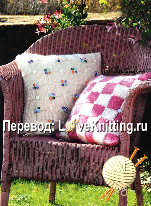Оригинальные два чехла для подушек выполнены по одной и той же схеме, но как по-разному они выглядят и как нестандартно украшены пуговицами! Размер: 40 см х 40 см ВАМ ПОНАДОБИТСЯ — для двухцветной подушки: — для однотонной подушки: УЗОРЫ Лицевая гладь: лиц. р. – лиц. п., изн. р. – изн. п.; Изнаночная гладь: лиц. р. – изн. п., изн. р. – лиц. п.; Узор «квадраты» (22 п.): вязать лиц. гладью по схеме в технике интарсия (см. Азы). Повторять 1-28-й р. ПЛОТНОСТЬ ВЯЗАНИЯ Лицевая гладь: 18 п. и 23 р. = 10 см х 10 см. Двухцветная подушка На спицы розовой пряжей * набрать 11 п., белой пряжей 11 п., повторять от *, всего 77 п. (7 квадратов) и вязать по схеме. На высоте 7 квадратов от начала работы петли закрыть. Одноцветная подушка Вязать по схеме так же, как двухцветную, но использовать только белую пряжу. ВНИМАНИЕ! Схема здесь.