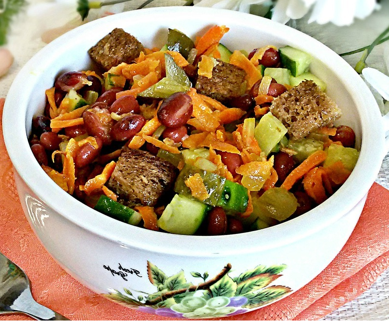 Салат с черным хлебом. На закуску самое то... Оригинальный и очень бюджетный салат. Ингредиенты: черный хлеб - 200 гр. фасоль красная в собственном соку - 1 банка огурец свежий или маринованный - 2 шт. морковь - 1 шт. лук репчатый - 1 шт. растительное масло для жарки- 1 ст. ложка майонез - 2-3 ст. ложки или растительное масло Обязательно возьмите для рецепта черный хлеб, именно в нём вся "изюминка". Черный хлеб порежьте мелком кубиком и подсушите в духовке. Огурцы можно взять свежие или маринованные. А можно обоих поровну. Морковь натереть на терке либо порезать соломкой и обжарить на растительном масле с луком. Фасоль для салата можно сварить самостоятельно, на вкус это не повлияет, но себестоимость блюда существенно снизится. В салатнике смешать фасоль, огурцы, обжаренные морковь с луком и заправить майонезом или растительным маслом. Когда именно салат смешивать перед подачей или заранее, дело вкуса, так как кто-то любит сухариками похрустеть, а кто-то любит, когда они станут с