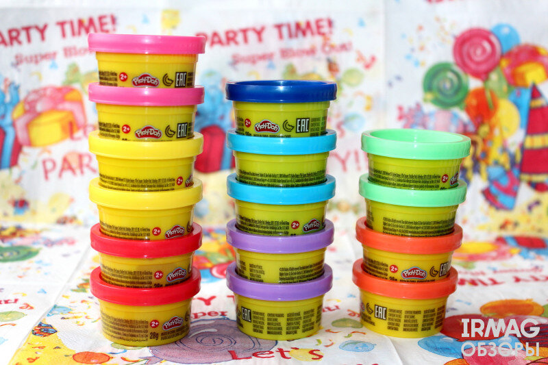 Обзор набора для лепки Play-Doh Наборы для лепки Play-Doh Трудно представить детство без лепки и игры с пластилином. Наше первое знакомство с Play-Doh произошло, когда дочке был 1 годик. Какой пластилин покупать для развития мелкой моторики у годовалого ребенка, мне долго думать не пришлось. Наверное, все помнят наш советский пластилин, тот самый жесткий, который любит, что бы его перед лепкой сначала разогрели и размяли, а после он оставляет жирный налет на руках и на всех поверхностях. Такой вариант маленькой дочке было еще не осилить, вот и взяла я на пробу 3 баночки Play-Doh. Пластилин пошел на ура! Со временем мы приобрели несколько наборов этой марки. И периодически приходилось докупать к ним только сам пластилин. Но обо всем по порядку. Виновник сегодняшнего торжества набор для праздника Play-Doh. В набор входит 15 баночек с пластилином весом 28 гр. и 16 наклеек, они оказались приятным сюрпризом для Лины. Дочка просто обожает клеить различные наклейки, и увидев их, сразу решила