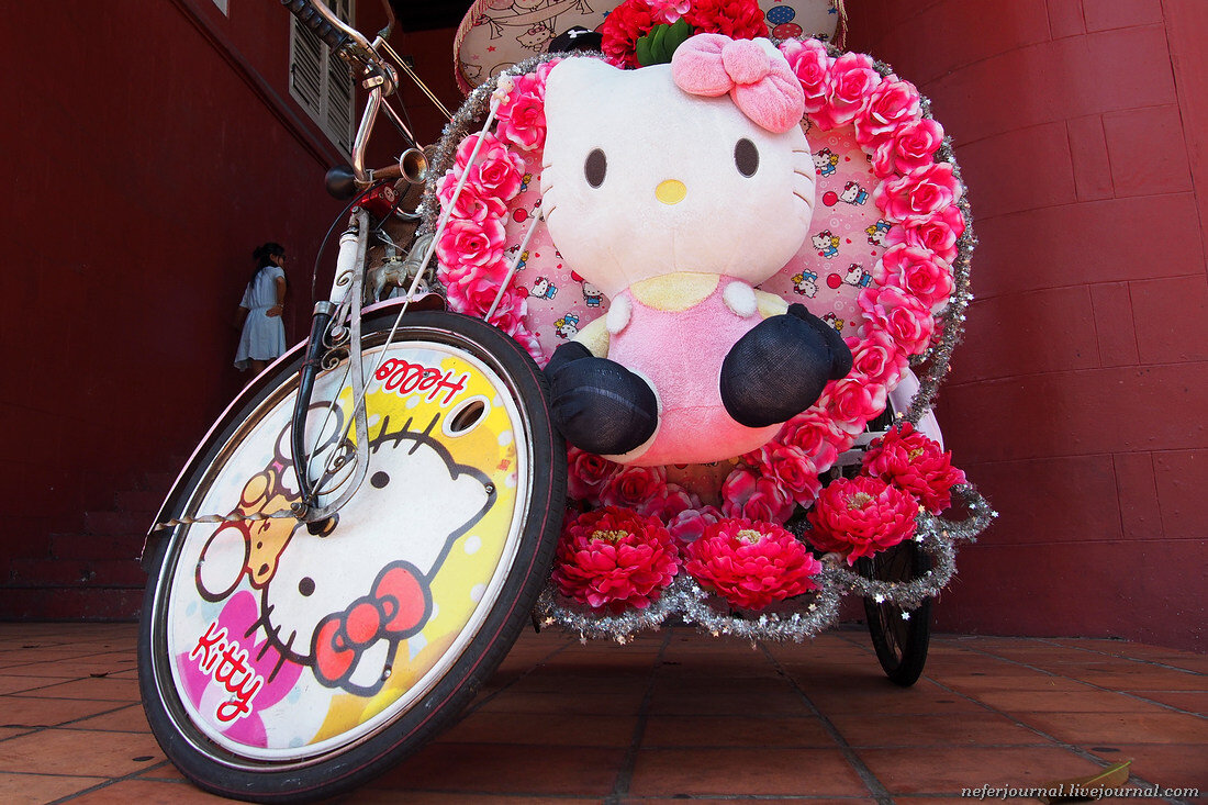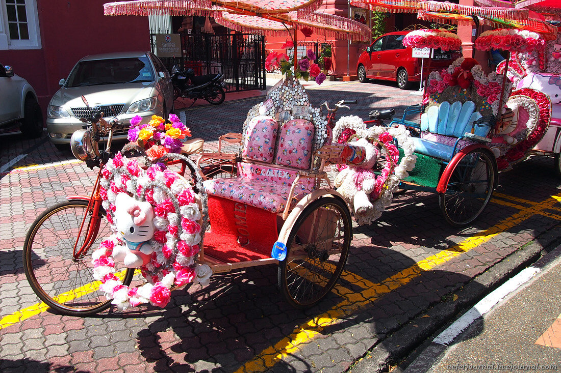 Это просто чума! По Малакке разъезжают вот такие кибитки. Хэллоу Китти, Покемоны, Миньоны, Лило и Стич, диснеевские принцессы с Майклом Джексоном - все это доведено до абсурда. Главные потребители такого продукта японцы и китайцы. Музыка орет, вокруг гроздьями свисают мягкие игрушки, а они едут и тащатся :)